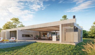 Estructura de hormigón armado, muros en paneles SIP de hormigón liviano y revestimientos de placas de hormigón y chapa acanalada gris grafito, eléctrica, sanitaria, pintura, carpintería.